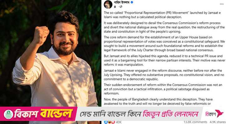 বাংলাদেশ জামায়াতে ইসলামীর সংখ্যানুপাতিক নির্বাচন নিয়ে আন্দোলনকে ‘সুপরিকল্পিত প্রতারণা’ হিসেবে উল্লেখ করেছেন জাতীয় নাগরিক পার্টির (এনসিপি) আহ্বায়ক নাহিদ ইসলাম। এ ঘটনার পর সামাজিক যোগাযোগমাধ্যম ফেসবুকে তার পোস্ট নিয়ে তুমুল প্রতিক্রিয়া দেখা যাচ্ছে।