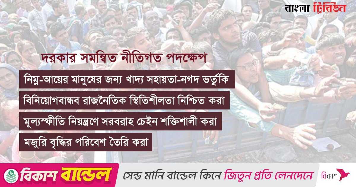 বিশেষজ্ঞদের মতে, এখনই দরকার সমন্বিত নীতিগত পদক্ষেপ—মজুরি বৃদ্ধির পরিবেশ তৈরি করা, মূল্যস্ফীতি নিয়ন্ত্রণে আনতে সরবরাহ চেইন শক্তিশালী করা, নিম্ন আয়ের মানুষের জন্য খাদ্য সহায়তা ও নগদ ভর্তুকি বাড়ানো এবং বিনিয়োগবান্ধব রাজনৈতিক স্থিতিশীলতা নিশ্চিত করা।