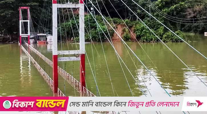 টানা বৃষ্টি, উজান থেকে নেমে আসা পাহাড়ি ঢলের কারণে রাঙামাটির নিম্নাঞ্চলগুলো হ্রদের পানিতে তলিয়ে যায়। সেইসঙ্গে ডুবে যায় ঝুলন্ত সেতু।