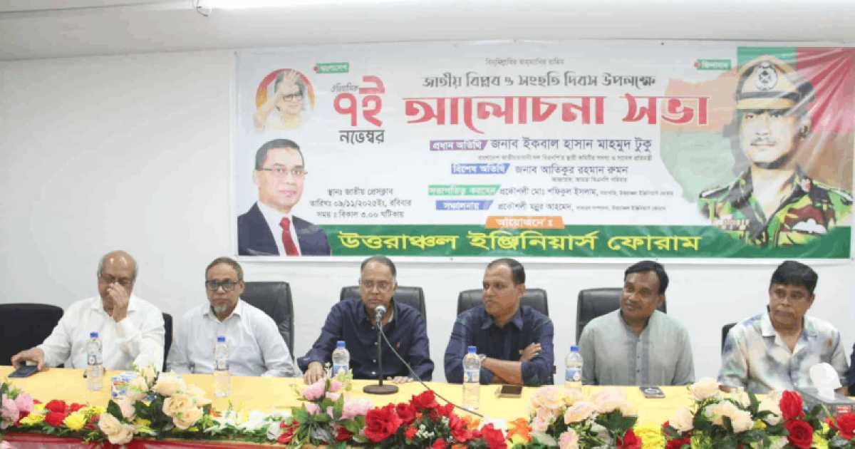 রবিবার (৯ নভেম্বর) জাতীয় প্রেসক্লাবে ঐতিহাসিক ৭ নভেম্বর জাতীয় বিপ্লব ও সংহতি দিবস উপলক্ষে উত্তরাঞ্চল ইঞ্জিনিয়ার্স ফোরামের উদ্যোগে আয়োজিত আলোচনা সভায় তিনি এসব কথা বলেন।