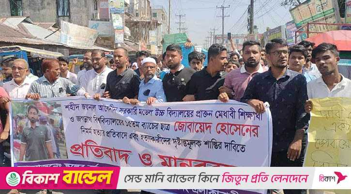 নোয়াখালীর সুবর্ণচরে শহীদ জয়নাল আবেদীন সরকারি মডেল উচ্চবিদ্যালয়ের সাবেক শিক্ষার্থী ও জগন্নাথ বিশ্ববিদ্যালয়ের ১৫তম ব্যাচের ছাত্র জোবায়েদ হোসেন হত্যার প্রতিবাদে বিক্ষোভ মিছিল ও মানববন্ধন অনুষ্ঠিত হয়েছে।