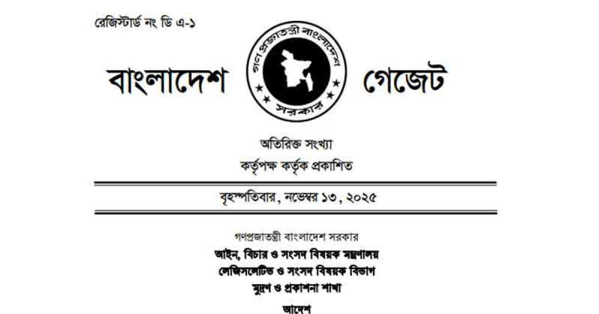 বৃহস্পতিবার (১৩ নভেম্বর) আইন বিচার ও সংসদ বিষয়ক মন্ত্রণালয় এই গেজেট প্রকাশ করে।