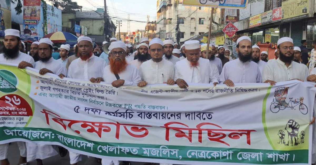 অবিলম্বে জুলাই সনদের পূর্ণাঙ্গ বাস্তবায়নসহ ৫ দফা দাবিতে ঘোষিত কর্মসূচির অংশ হিসেবে বাংলাদেশ খেলাফত মজলিসের উদ্যোগে দেশব্যাপী বিক্ষোভ মিছিল ও সমাবেশ করেছে দলটি।