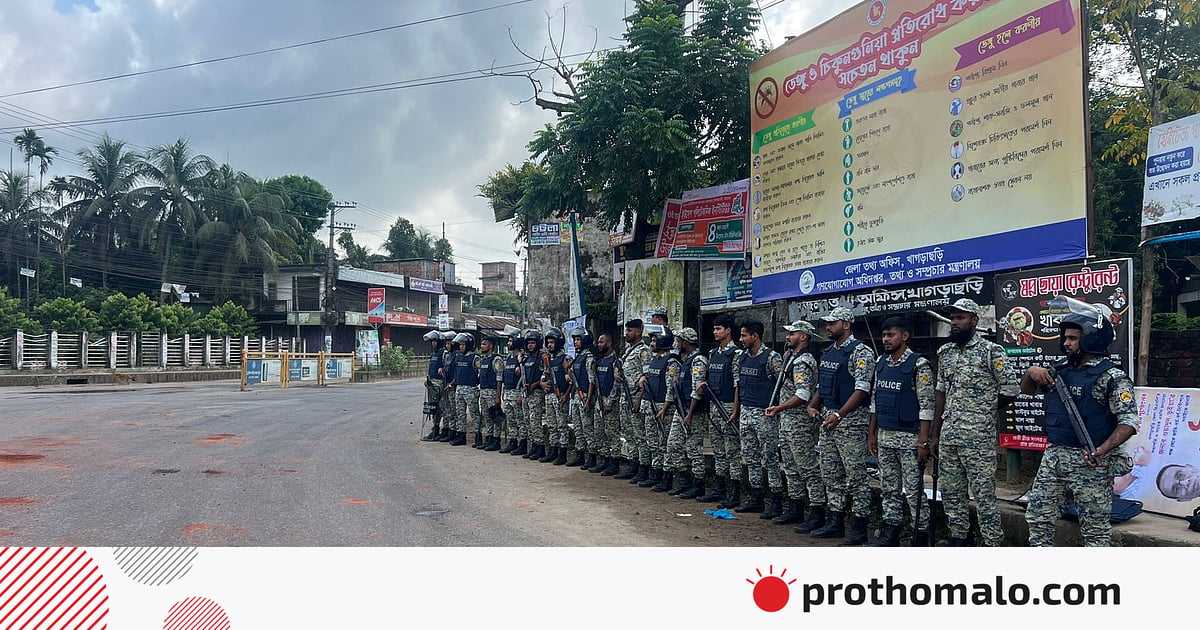 খাগড়াছড়িতে পাহাড়ি এক কিশোরীকে দলবদ্ধ ধর্ষণের প্রতিবাদে ‘জুম্ম ছাত্র-জনতা’–এর ব্যানারে ডাকা সড়ক অবরোধ চলছে। আজ রোববার সকাল থেকে শহরে কোনো ধরনের যান চলাচল করতে দেখা যায়নি। বন্ধ রয়েছে শহরের বেশির ভাগ দোকানপাট। আইনশৃঙ্খলা রক্ষাকারী বাহিনীর সদস্যদের বিভিন্ন মোড়ে অবস্থান নিয়ে টহল দিতে দেখা গেছে। পরিস্থিতি নিয়ন্ত্রণে শহরে সাত প্লাটুন বিজিবি মোতায়েন করা হয়েছে।