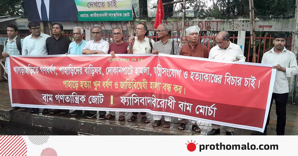 খাগড়াছড়িতে পাহাড়ি কিশোরীকে ধর্ষণকারীদের গ্রেপ্তার ও বিচারের দাবিতে বিক্ষোভ সমাবেশ করেছে বাম গণতান্ত্রিক জোট ও ফ্যাসিবাদ বিরোধী বাম মোর্চা। এ সময় ধর্ষণের ঘটনার প্রতিবাদে বিক্ষোভে অংশ নেওয়া তিনজন পাহাড়িকে হত্যার ঘটনায় দায়ীদেরও বিচারের দাবি জানিায়েছে তারা।