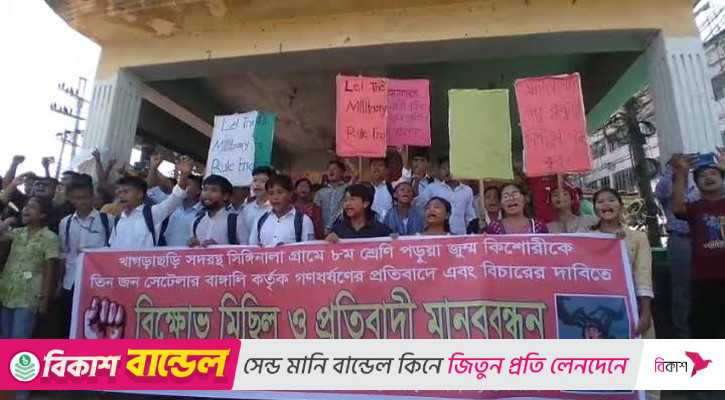সমাবেশে অভিযোগ করা হয়, খাগড়াছড়ি সরকারি বালিকা উচ্চ বিদ্যালয়ের অষ্টম শ্রেণির ছাত্রীকে গতকাল রাতে সংঘবদ্ধ ধর্ষণ করা হয়। ঘটনায় জড়িতদের অবিলম্বে গ্রেপ্তারসহ দৃষ্টান্তমূলক শাস্তির দাবিতে আগামীকাল বৃহস্পতিবার (২৫ সেপ্টেম্বর) খাগড়াছড়ি জেলায় আধাবেলা সড়ক অবরোধের ডাক দেওয়া হয়।