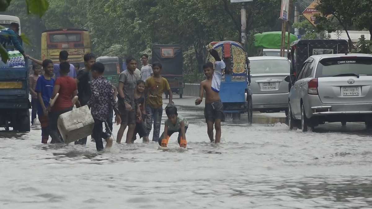 রাজধানীর মিরপুরের কালশি এলাকার অন্যতম ব্যস্ত একটি সড়ক। এ যেন নদীতে পরিণত হয়েছে। বৃষ্টির জমে থাকা পানিতে শিশুরা মেতে উঠেছে উল্লাসে। শৈশবের সুখে ওরা ভাসলেও চরম ভোগান্তি নাজেহাল পথচারী যাত্রীরা। জমে থাকা বৃষ্টির পানিতে বিকল হচ্ছে যান। গন্তব্যে যাওয়ার বিকল্প পথ খুঁজছেন কেউ কেউ।