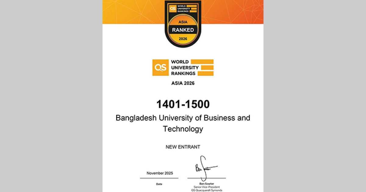 কিউ-এস এশিয়া ইউনিভার্সিটি র্যাঙ্কিংস-২০২৬ এ স্থান করে নিয়েছে বাংলাদেশ ইউনিভার্সিটি অব বিজনেস অ্যান্ড টেকনোলজি (বিইউবিটি)। এশিয়ার শীর্ষ ১৪০১-১৫০০ বিশ্ববিদ্যালয়ের তালিকায় বিইউবিটির অবস্থান নিশ্চিত হয়েছে এবং দক্ষিণ এশিয়ার মধ্যে ৪৫৪তম স্থান অর্জন করেছে। এক সংবাদ বিজ্ঞপ্তিতে এ তথ্য জানানো হয়।