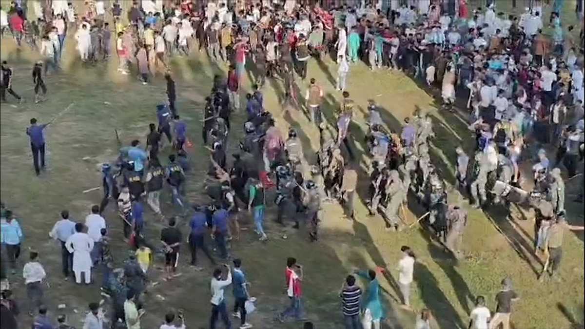 এ সময় অনেক দর্শক গেট ভেঙে ভেতরে প্রবেশ করেন। সেনাবাহিনী, পুলিশ ও র্যাবের সদস্যরা তাদের বের করতে গেলে উত্তেজনা সৃষ্টি হয়। একপর্যায়ে গ্যালারি ও আইনশৃঙ্খলা বাহিনীকে লক্ষ্য করে ইট-পাটকেল ছোঁড়া হয়। এ সময় সদরের ইউএনও নিলুফা ইয়াসমিনসহ অন্তত ২০ জন আহত হন। পরে পরিস্থিতি নিয়ন্ত্রণে আনে আইনশৃঙ্খলা বাহিনী। এক পর্যায়ে, বিকেল পাঁচটার দিকে পরিস্থিতি নিয়ন্ত্রণে আসে। তবে এখনো খেলা শুরু হয়নি।