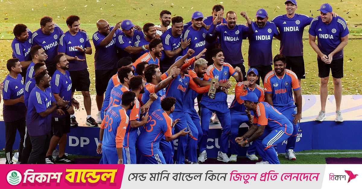 ট্রফি হাতে না পেলেও অবশ্য ভারতের উদ্যাপন থেমে থাকেনি। কল্পনা করা ট্রফি নিয়ে উদ্যাপন করেন দেশটির ক্রিকেটাররা। দুই হাতে ট্রফি ধরে আছেন, এমন ভঙ্গিতে এগিয়ে যাওয়ার পর একসঙ্গে লাফিয়ে ওঠেন ভারতের সব ক্রিকেটার। তাঁদের ফটোসেশনের আনুষ্ঠানিকতাও শেষ হয় বাস্তব কোনো ট্রফি ছাড়াই। এমন বিরল ঘটনার সাক্ষী হওয়ার পর আগ্রহের কেন্দ্র হয়ে ওঠে ভারতের অধিনায়ক সূর্যকুমার যাদবের সংবাদ সম্মেলন।