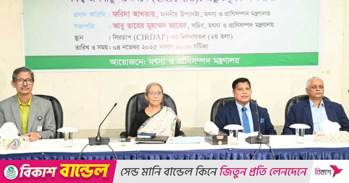 মঙ্গলবার (৪ নভেম্বর) সিরডাপ মিলনায়তনে বিশ্ব জলবায়ু সম্মেলনের (কপ-৩০) প্রস্তুতিমূলক কর্মশালায় তিনি এসব কথা বলেন। কর্মশালার আয়োজন করে মৎস্য ও প্রাণিসম্পদ মন্ত্রণালয়।
