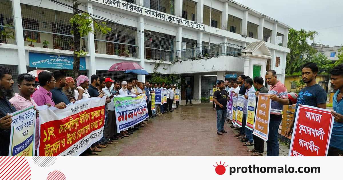 কুষ্টিয়ার কুমারখালীর চরসাদিপুর ইউনিয়নকে গোপনে পাবনার সঙ্গে সংযুক্তের পাঁয়তারা করার অভিযোগ উঠেছে। এর প্রতিবাদে আজ রোববার দুপুরে কুমারখালী উপজেলা পরিষদ চত্বরে মানববন্ধন ও প্রতিবাদ সভার আয়োজন করে এলাকাবাসী। মানববন্ধন শেষে চরসাদিপুরকে পাবনার সঙ্গে সংযুক্ত না করার দাবিতে কুমারখালী উপজেলা প্রশাসনের কাছে গণপিটিশন জমা দেন এলাকাবাসী।