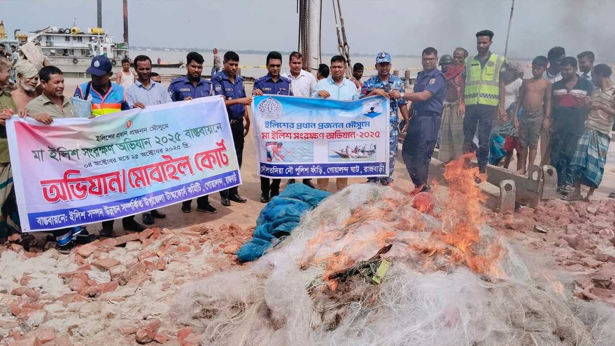 তিনি জানান, গতকাল বিকেল ৩টা থেকে আজ বিকেল ৩টা পর্যন্ত জেলা ও উপজেলা পর্যায় থেকে প্রশাসন ও আইনশৃঙ্খলা রক্ষাকারী বাহিনীর সহযোগিতায় রাজবাড়ীর পদ্মা নদীর অংশে ৭টি অভিযান পরিচালনা করা হয়েছে। অভিযানে ৫০ হাজার মিটার জাল ও ৫ কেজি ইলিশ মাছের পাশাপাশি গোয়ালন্দের কলাবাগান এলাকা থেকে একটি ইঞ্জিন চালিত মাছ ধরা নৌকা আটক করা হয়েছে। এ সময় জেলেরা নৌকা রেখে পালিয়ে যায়।