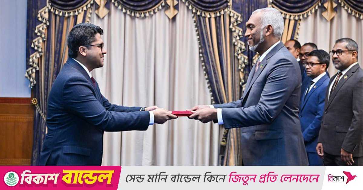 মালদ্বীপে বাংলাদেশের নবনিযুক্ত হাইকমিশনার ড. মো. নাজমুল ইসলাম মালদ্বীপের রাষ্ট্রপতি ড. মোহাম্মদ মুইজ্জুর কাছে পরিচয়পত্র পেশ করেছেন। সোমবার (৬ অক্টোবর) স্থানীয় সময় দুপুর ১টায় রাষ্ট্রপতি প্রাসাদের রিপাবলিক স্কয়ারে পৌঁছানোর পরে হাইকমিশনারকে মালদ্বীপ ন্যাশনাল ডিফেন্স ফোর্সের (এমএনডিএফ) একটি স্মার্ট দল গার্ড অব অনার দেয়। পরে এমএনডিএফ ড্রাম ও ট্রাম্পেট ব্যান্ডের সঙ্গে হাইকোলহু নামে একটি ঐতিহ্যবাহী সাংস্কৃতিক শোভাযাত্রায় হাইকমিশনারকে রিপাবলিক স্কয়ার থেকে রাষ্ট্রপতির কার্যালয়ে নিয়ে যাওয়া হয়।