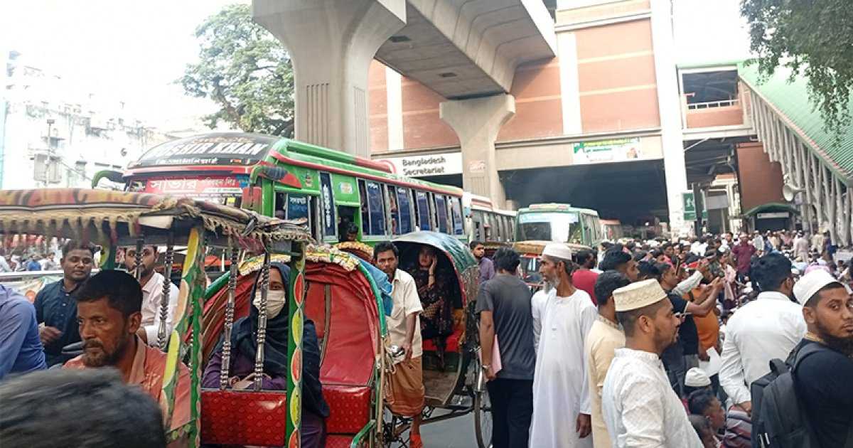 রবিবার বিকালে সরেজমিন দেখা যায়, একদিকে মেট্রোরেল বন্ধ থাকায় বিপুল যাত্রীর অপেক্ষা, অন্যদিকে সড়কের অর্ধেকের বেশি জায়গাজুড়ে বিভিন্ন সংগঠন মিছিল-সমাবেশ করছে। এ কারণে দেখা দিয়েছে যানজট। এ পথে চলাচলকারী উত্তরা ও মিরপুরগামী যাত্রীরা পড়েছেন চরম বিপাকে।
