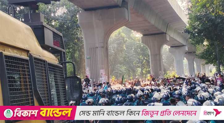 এ সময় শিক্ষকরা ‘দাবি মেনে নে, নয়তো বুকে বুলেট দে’, ‘৫ পার্সেন্ট দাবি মানি না, মানবো না’, ‘এক দুই তিন চার এই মুহূর্তে গদি ছাড়’ স্লোগান দেন। কিছুক্ষণ সংশ্লিষ্ট সড়ক অবরোধ করে রাখেন শিক্ষকরা। নিরাপত্তার দায়িত্বে থাকা পুলিশ ও বিজিবি সদস্যরা তাদের ঘেরাও করেন। ঘটনাস্থলে জলকামান ও সাজোয়ার যানও সতর্ক অবস্থায় রাখা হয়।