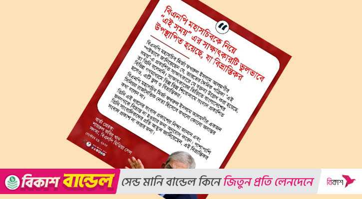 আরও বলা হয়, বিএনপি মহাসচিব মির্জা ফখরুল ইসলাম আলমগীর স্পষ্টভাবে জানিয়েছেন যে, ভারতের দৈনিক পত্রিকা “এই সময়”-এ প্রকাশিত সাক্ষাৎকারে যে বক্তব্য উল্লেখ করা হয়েছে, তা তিনি বলেননি। সাক্ষাৎকারের ভিত্তিতে বাংলাদেশের বিভিন্ন গণমাধ্যমে ভিন্ন ভিন্ন শিরোনামে সংবাদ প্রকাশিত হলেও, এটি ভুল ও বিভ্রান্তিকর।