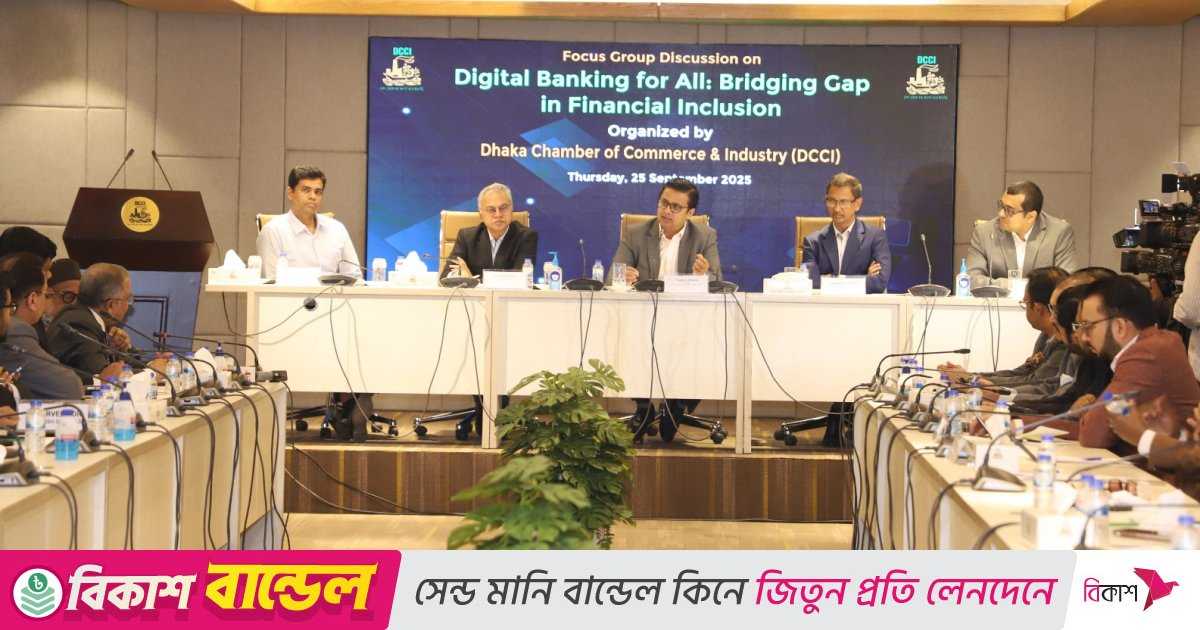 ঢাকা চেম্বার অব কমার্স অ্যান্ড ইন্ডাস্ট্রি (ডিসিসিআই) আয়োজিত ‘সবার জন্য ডিজিটাল ব্যাংকিং: আর্থিক অন্তর্ভুক্তির ব্যবধান দূরীকরণ’ শীর্ষক ফোকাস গ্রুপের আলোচনা সভায় বক্তারা বলেছেন, বাংলাদেশে ডিজিটাল ব্যাংকিং খাতের সম্ভাবনা ব্যাপক হলেও নীতি সহায়তার অভাব, আস্থাহীনতা, দুর্বল অবকাঠামো এবং নিয়ন্ত্রক সংস্থাগুলোর সমন্বয়হীনতার কারণে এ খাত পূর্ণাঙ্গভাবে বিকশিত হতে পারছে না।
