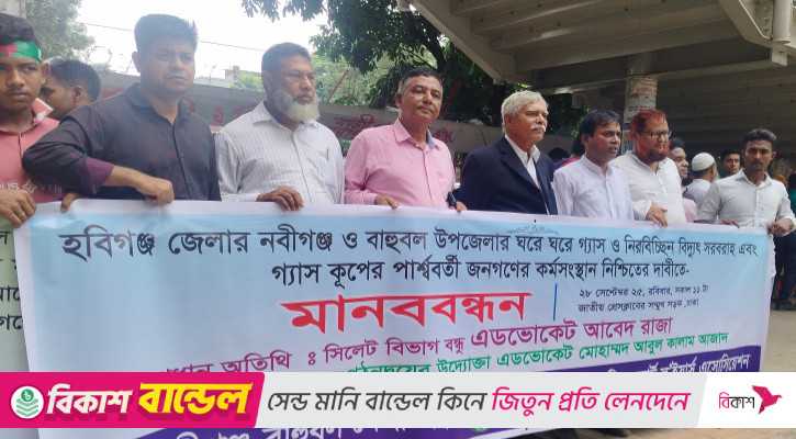 হবিগঞ্জ জেলার নবীগঞ্জ ও বাহুবল উপজেলার বাসিন্দারা তাদের ন্যায্য অধিকার হিসেবে ঘরে ঘরে গ্যাস ও বিদ্যুৎ সংযোগের দাবিতে মানববন্ধন করেছেন। গ্যাসকূপের পাশে বসবাস করেও সংযোগ না পাওয়া এবং কর্মসংস্থানের সুযোগ না থাকাকে কেন্দ্র করে এই প্রতিবাদ কর্মসূচি পালিত হয়।