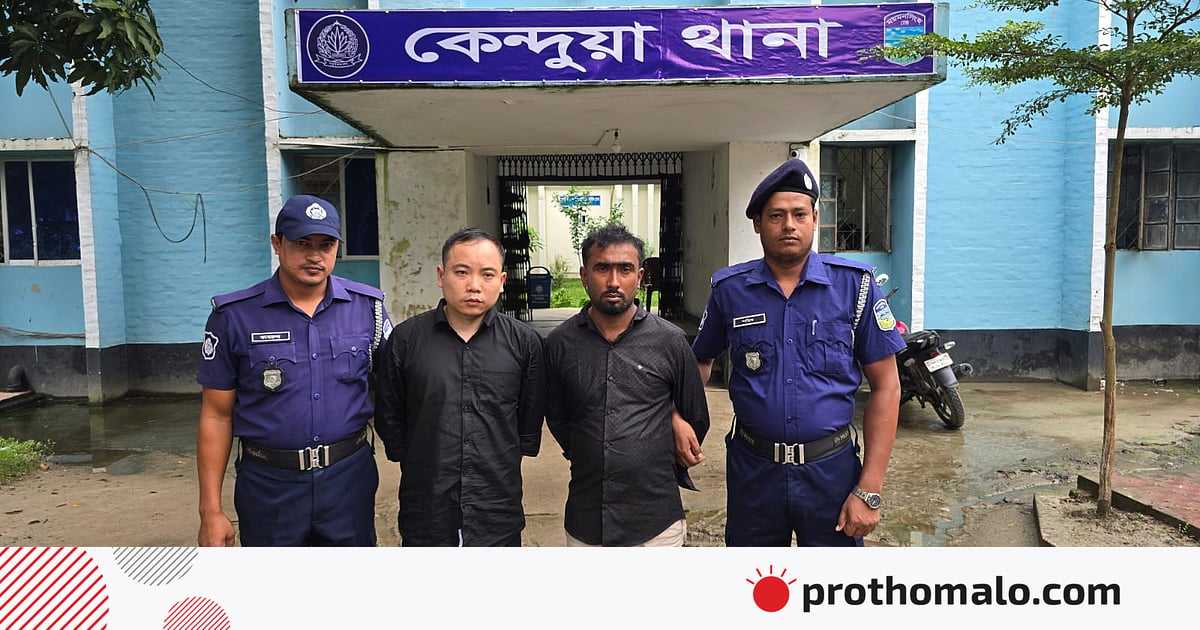 আটক হওয়া চীনা নাগরিকের নাম লি ওই হাও (৩২)। আর তাঁর সহযোগী হলেন ফরিদুল ইসলাম (৩৪)। তিনি কুড়িগ্রামের রাজারহাট উপজেলার সুখদেব পশ্চিম পাড়া গ্রামের আবদুল হানিফ মিয়ার ছেলে। নেত্রকোনা পুলিশ সুপার মির্জা সায়েম মাহমুদ এ তথ্য নিশ্চিত করেছেন।
