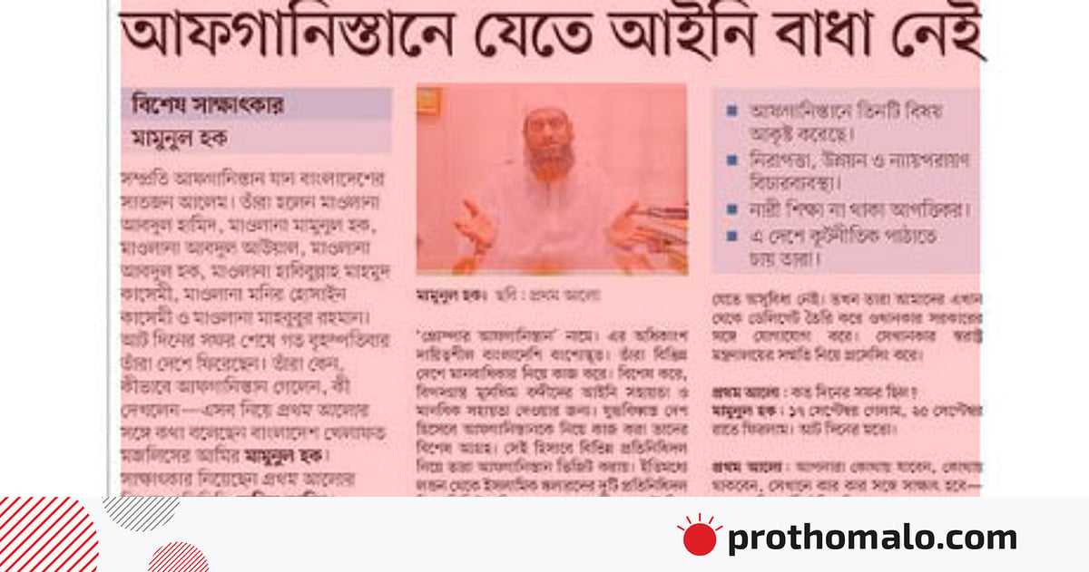 ‘আফগানিস্তানে যেতে আইনি বাধা নেই’ শিরোনামে প্রকাশিত ওই সাক্ষাৎকারের একটি অংশে মামুনুল হক উল্লেখ করেন, ‘জাতীয় ঐকমত্য কমিশন থেকে বাংলাদেশে বিভিন্ন বিষয়ে জরিপ চালানো হয়েছিল। সেখানে ৭০ থেকে ৮০ শতাংশ মানুষ শরিয়াহ শাসন চেয়েছে।’