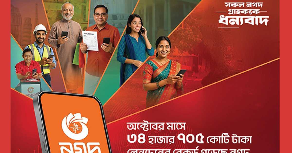 সদ্য শেষ হওয়া অক্টোবর মাসে মোবাইল অর্থিক সেবা দানকারী প্রতিষ্ঠান নগদ সর্বোচ্চ লেনদেনের নতুন রেকর্ড করেছে। এ মাসে ৩৪ হাজার ৭০৫ কোটি টাকার বেশি লেনদেন করেছে প্রতিষ্ঠানটি। এক সংবাদ বিজ্ঞপ্তিতে এ তথ্য জানানো হয়েছে।