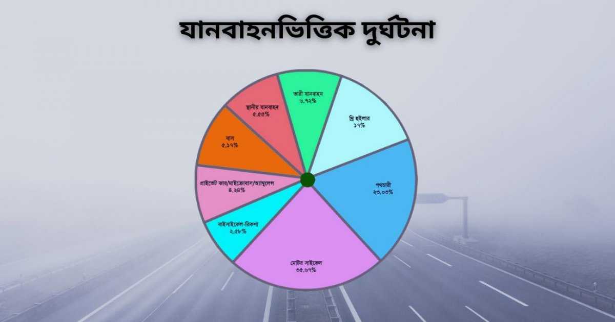 রোড সেফটি ফাউন্ডেশনের বিশ্লেষণ বলছে, সবচেয়ে বেশি প্রাণহানি ঘটেছে মোটরসাইকেল দুর্ঘটনায় ১১ হাজার ৮৬৪ জন, যা মোট মৃত্যুর ৩৫.৬৭ শতাংশ। দ্বিতীয় অবস্থানে রয়েছে পথচারী, গত পাঁচ বছরে সড়ক দুর্ঘটনায় ৭ হাজার ৬৫৯ জন পথচারী নিহত হয়েছেন, যা মোট মৃত্যুর ২৩.০৩ শতাংশ। এরপরে রয়েছে থ্রি-হুইলারচালক ও যাত্রী নিহত ৫ হাজার ৬৫৭ মানুষ, যা মোট মৃত্যুর ১৭ শতাংশ। এছাড়াও নিহতদের মধ্যে ভারী যানবাহনের যাত্রী ৬.৭২ শতাংশ, বাসযাত্রী ৫.১৭ শতাংশ, স্থানীয় যানবাহন ৫.৫৫ শতাংশ, প্রাইভেটকার/মাইক্রোবাস/অ্যাম্বুলেন্স ৪.২৪ শতাংশ এবং বাইসাইকেল ও রিকশা ২.৫৮ শতাংশ।