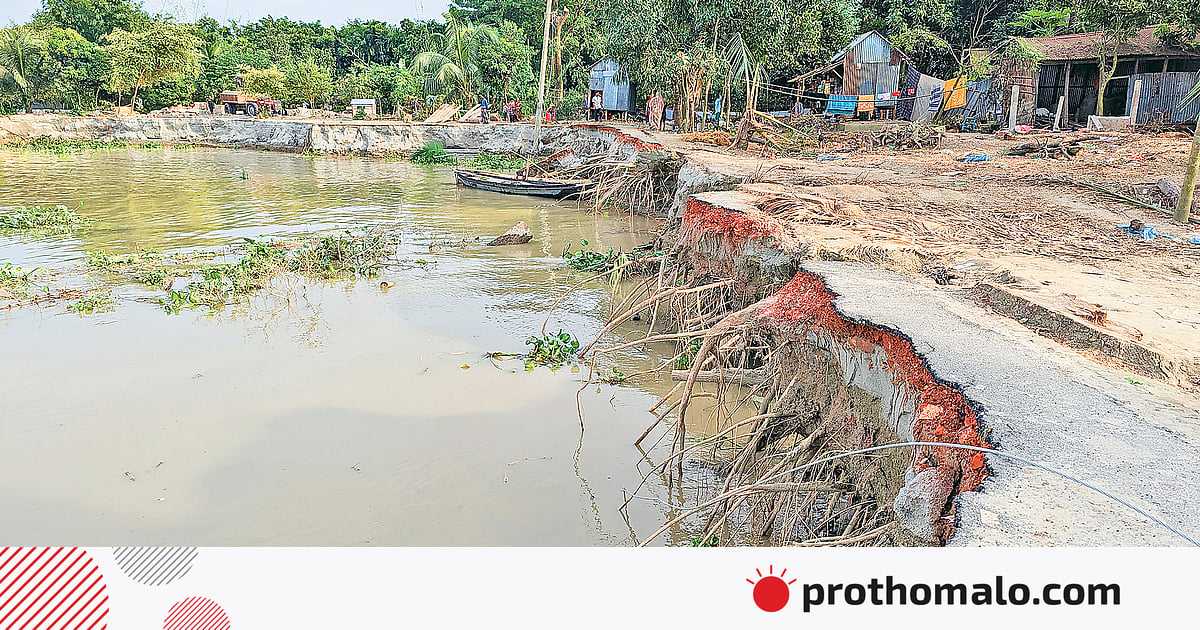 গত সোমবার পূর্ব নাওডোবা ইউনিয়নের পৈলান মোল্যাকান্দি এলাকায় গিয়ে দেখা যায়, নদীর তীরের বাসিন্দারা তাঁদের বসতঘর সরিয়ে নিচ্ছেন। জিরোপয়েন্ট থেকে পালেরচর বাজারে যাওয়ার যে সড়কটি ছিল, তার দেড় কিলোমিটার নদীতে বিলীন হয়ে গেছে। ওই এলাকায় নদীর তীর রক্ষা বাঁধ নির্মাণে যে বালুভর্তি জিও ব্যাগ ফেলা হয়েছিল, তা নদীতে ভেসে গেছে। ভাঙনে নদী স্থানভেদে ১০ থেকে ১১০ মিটার ভেতরে প্রবেশ করছে। নদীর তীরজুড়ে পাথরের ব্লক জড়ো করে রাখা হয়েছে। কিছু স্থানে পাথরের ব্লকও নদীতে বিলীন হয়ে গেছে।