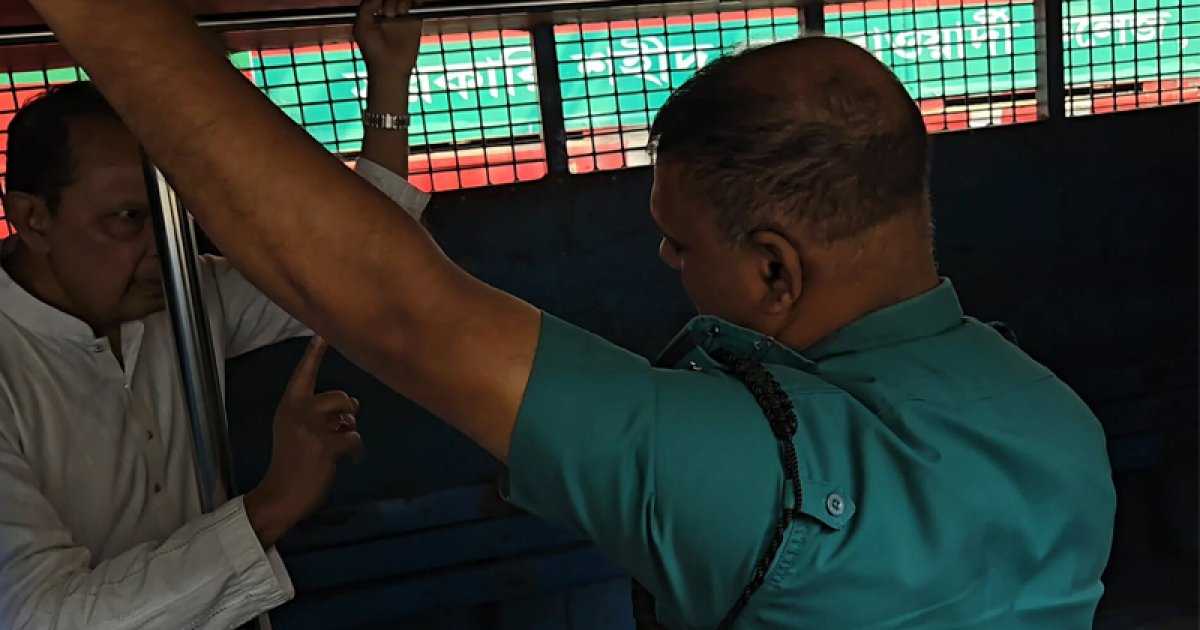 প্রিজন ভ্যানে দাঁড়িয়ে থেকে কারাগারের উদ্দেশ্য যাত্রা করেন সাবেক তথ্যমন্ত্রী ও জাতীয় সমাজতান্ত্রিক দলের (জাসদ) সভাপতি হাসানুল হক ইনু।