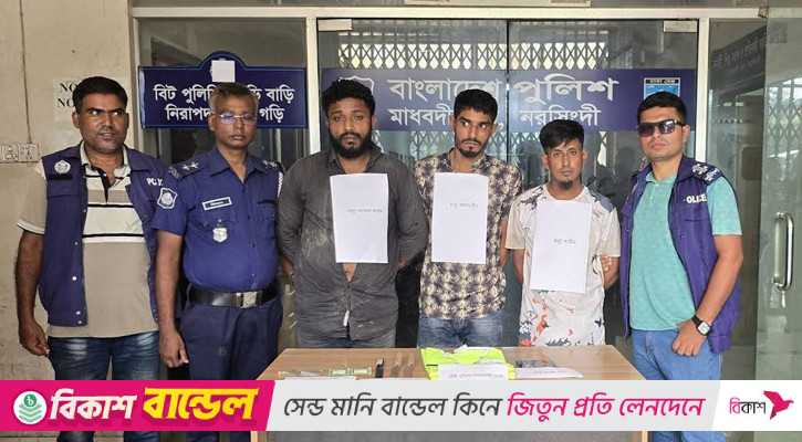 নরসিংদী: নরসিংদীর পাঁচদোনায় পুলিশের পোশাক পরে ছিনতাই করে টাকা ভাগবাটোয়ারা করার সময় দেশীয় অস্ত্রসহ তিনজনকে আটক করেছে স্থানীয় লোকজন।