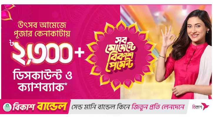 এবারও শারদীয় দুর্গা উৎসবকে সামনে রেখে কেনাকাটাকে আরও সহজ, সাশ্রয়ী ও আনন্দময় করতে বিকাশ নিয়ে এসেছে অনলাইন ও অফলাইন কেনাকাটায় আকর্ষণীয় সব ডিসকাউন্ট ও ক্যাশব্যাক অফার।