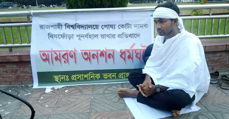 পোষ্যকোটা বাতিলের দাবিতে অনশন করছেন রাজশাহী বিশ্ববিদ্যালয়ের শিক্ষার্থীরা। এরইমধ্যে বৃষ্টিতে ভিজে অসুস্থ হয়ে এক শিক্ষার্থী হাসপাতালে ভর্তি হয়ছেন।