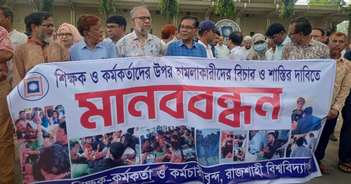 শুক্রবার (২০ সেপ্টেম্বর) রাজশাহী বিশ্ববিদ্যালয়ের (রাবি) উপ-উপাচার্য (প্রশাসন), প্রক্টরসহ শিক্ষক ও কর্মকর্তাদের লাঞ্ছিতকারীদের দৃষ্টান্তমূলক শাস্তির দাবিতে মানববন্ধন অনুষ্ঠিত হয়েছে। সোমবার (২২ সেপ্টেম্বর) সকাল ১১টায় বিশ্ববিদ্যালয়ের প্যারিস রোডে শিক্ষক, কর্মকর্তা ও কর্মচারীদের আয়োজনে এই কর্মসূচি পালিত হয়।