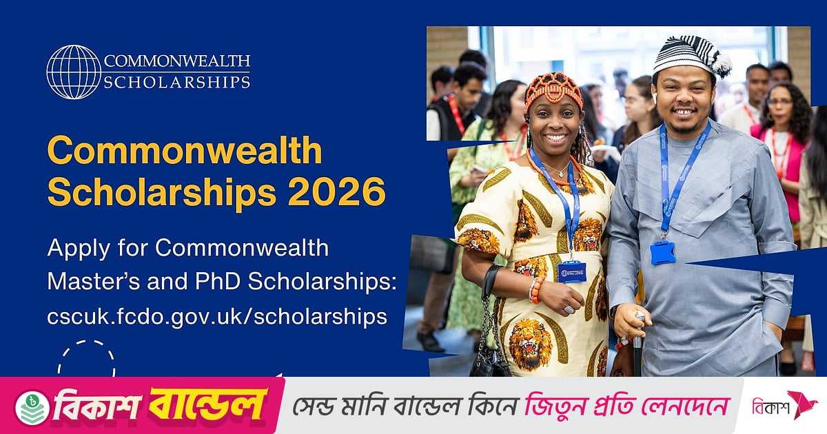 ২০২৬ সালের কমনওয়েলথ স্কলারশিপের জন্য ইউজিসি (https://ugc.gov.bd/) বিজ্ঞপ্তি প্রকাশ করেছে। ২৫ সেপ্টেম্বর ২০২৫-এর মধ্যে আবেদন জমা দিতে হবে। বাংলাদেশি শিক্ষার্থীরা এই বৃত্তি নিয়ে স্নাতকোত্তর ও পিএইচডি করতে পারবেন যুক্তরাজ্যের বিখ্যাত বিশ্ববিদ্যালয়গুলোয়। মোহাম্মদ জহিরুল হক প্রথম আলোর সঙ্গে কমনওয়েলথ স্কলারশিপে আবেদনের যোগ্যতা, ভর্তিপ্রক্রিয়া ও আবেদনসংশ্লিষ্ট বিষয়ে কথা বলেছেন।