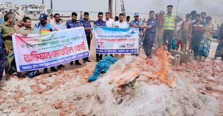 মা ইলিশ সংরক্ষণ অভিযানের অংশ হিসেবে গত ২৪ ঘণ্টায় রাজবাড়ীর পদ্মা নদীর অংশে অভিযান চালিয়ে ৫০ হাজার মিটার জাল ও ৫ কেজি ইলিশ মাছ জব্দ করা হয়েছে। একই সঙ্গে জব্দ করা একটি ইঞ্জিনচালিত মাছ ধরার নৌকা নিলামে ৩৬ হাজার টাকায় বিক্রি করা হয়েছে।