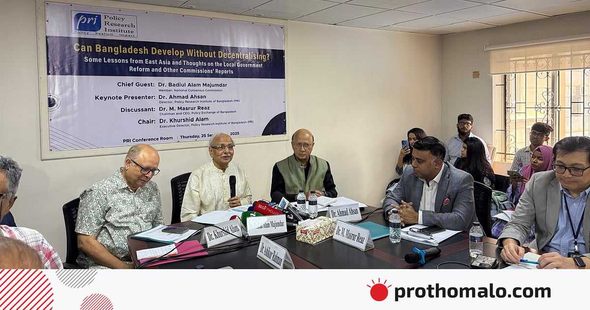 ‘বিকেন্দ্রীকরণ ছাড়া কি বাংলাদেশের উন্নয়ন সম্ভব?’ শীর্ষক আলোচনায় মূল প্রবন্ধ উপস্থাপন করেন পিআরআইয়ের পরিচালক আহমেদ হাসান। তিনি বলেন, বিকেন্দ্রীকরণ ছাড়া বাংলাদেশের টেকসই উন্নয়ন সম্ভব নয়। কারণ স্থানীয় পর্যায়ে দায়বদ্ধতা না থাকায় শিক্ষা ও স্বাস্থ্য খাতে গুণগত মান কমে গেছে। সাধারণ মানুষ এর ফল সরাসরি ভোগ করছে।