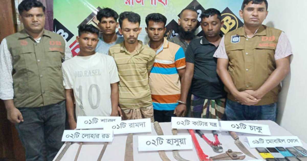 পুলিশ কর্মকর্তা রফিকুল আলম জানান, গত ৫ সেপ্টেম্বর রাতে রাজশাহীর তানোর উপজেলার মালশিরা গ্রামের মোয়াজ্জেমুল হোসেনের বাড়িতে ডাকাতি হয়। ডাকাতরা বাড়ির মূল দরজা ভেঙে ঢুকে সবাইকে গামছা দিয়ে বেঁধে ফেলেছিল। পরে চারটি মোবাইল ফোন, আড়াই লাখ টাকা, স্বর্ণালঙ্কার ও একটি মোটরসাইকেল নিয়ে পালিয়ে যায়। এ ঘটনায় তানোর থানায় মামলা হয়। ডিবি পুলিশ জয়পুরহাটের আক্কেলপুর উপজেলার তিলকপুর রেলস্টেশন সংলগ্ন একটি ভাড়া বাসা থেকে সাত ডাকাতকে এবং নওগাঁ সদর উপজেলার ইদুর বটতলা এলাকার মনোরমা জুয়েলার্স থেকে অন্য একজনকে গ্রেফতার করে। তাদের কাছ থেকে ডাকাতির কাজে ব্যবহৃত নানা সরঞ্জাম ও ডাকাতি করা ৮৫ হাজার টাকা উদ্ধার করা হয়েছে।
