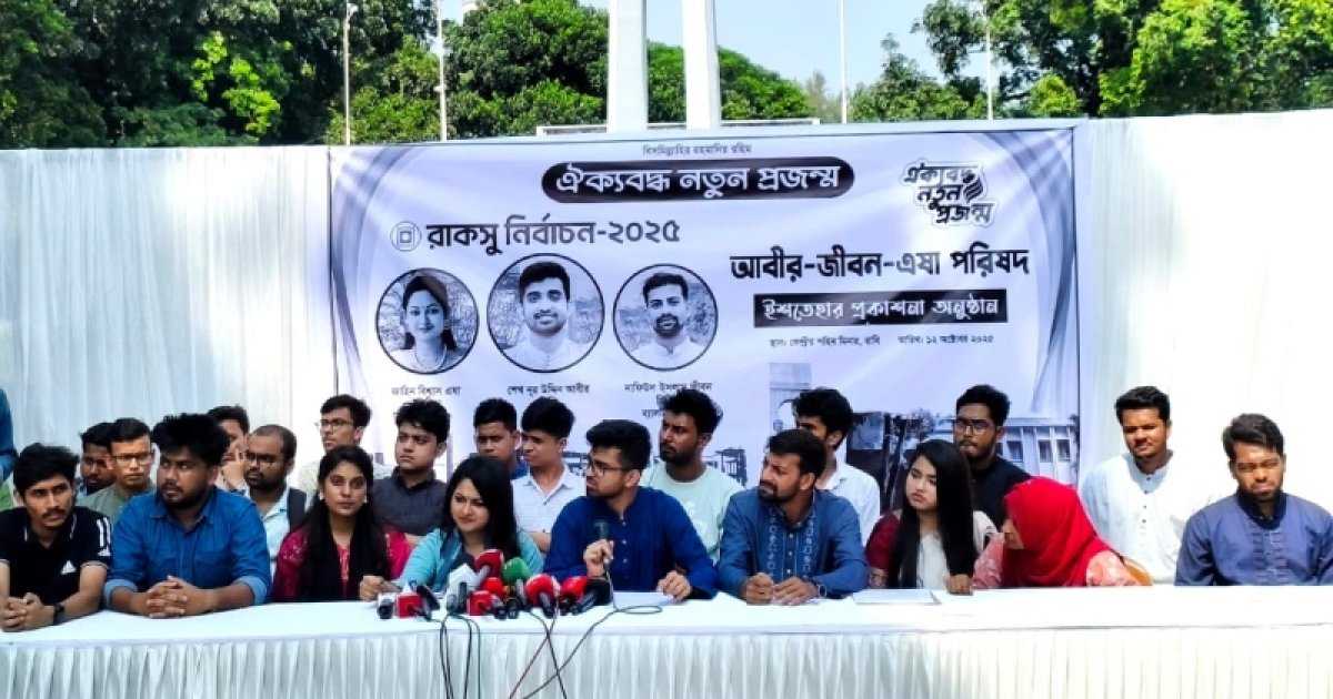 রাজশাহী বিশ্ববিদ্যালয় কেন্দ্রীয় ছাত্র সংসদ (রাকসু) নির্বাচনে ছাত্রদল সমর্থিত প্যানেল ‘ঐক্যবদ্ধ নতুন প্রজন্ম’- দশ দফা ইশতেহার ঘোষণা করেছে। সোমবার (১২ অক্টোবর) দুপুরে বিশ্ববিদ্যালয়ের শহীদ মিনার চত্বরে আয়োজিত এক সংবাদ সম্মেলনে প্যানেলের সহ-সভাপতি (ভিপি) পদপ্রার্থী শেখ নূর উদ্দিন আবির ইশতেহার ঘোষণা করেন।