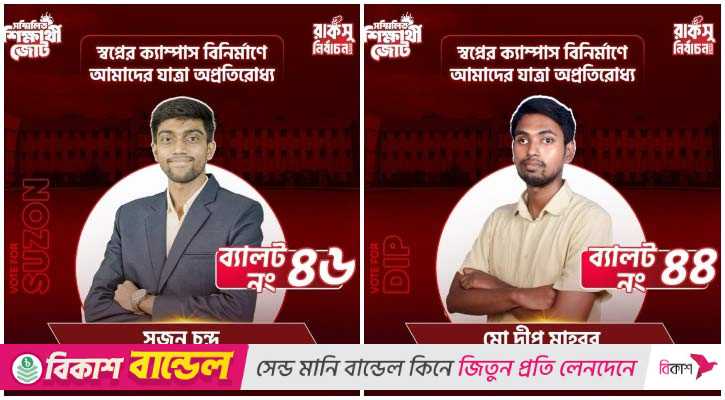 রাজশাহী বিশ্ববিদ্যালয় কেন্দ্রীয় ছাত্র সংসদ (রাকসু) নির্বাচনে কার্যনির্বাহী সদস্য পদে ছাত্রশিবির সমর্থিত ‘সম্মিলিত শিক্ষার্থী জোট’ প্যানেল থেকে সনাতন ধর্মালম্বী সুজন চন্দ্র ও জুলাই আন্দোলনে চোখ হারানো দ্বীপ মাহবুব জয়ী হয়েছেন।