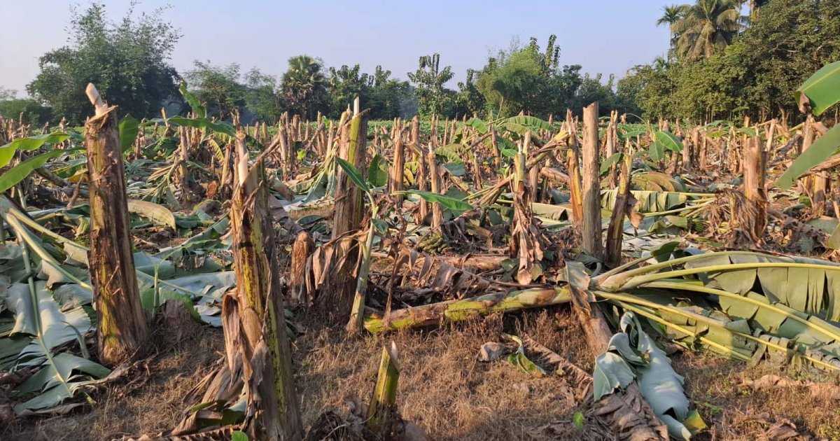 তিনি আরও বলেন, ‘সুদে তিন লাখ টাকা নিয়ে দেড় বিঘা জমিতে কলাগাছের বাগান করেছিলেন। এক হাজার কলাগাছের মধ্যে প্রায় ৭শ গাছের কলা পাকা শুরু হয়েছিল। আর এক সপ্তাহের মধ্যে বাজারে কলা তোলা যেত। দেড় বিঘা জমিতে কলাবাগান করতে প্রায় ৩ থেকে সাড়ে ৩ লাখ টাকা খরচ হয়। এলাকার দোকান থেকে সার ও কীটনাশক বাকি নেওয়া হয়েছে। এখন সুদের টাকা ও দোকান বকেয়ার টাকা পরিশোধ করা নিয়ে মহাবিপাকে পড়েছি।’ কলাবাগানে গিয়ে কথা বলতে বলতে কান্নায় ভেঙে পড়েন কৃষক রুস্তম আলী। দীর্ঘদিন ধরে কলা চাষ করে জীবিকা নির্বাহ করছেন তিনি।