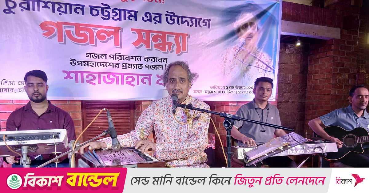 চট্টগ্রাম নগরীর আগ্রাবাদ এলাকার একটি রেস্টুরেন্টে গতকাল বৃহস্পতিবার সন্ধ্যায় গজল শিল্পী শাহজাহান খানের একক পরিবেশনায় ভিন্ন রকম এক সন্ধ্যা কাটান দর্শক-শ্রোতারা। চুরাশিয়ান চট্টগ্রামের উদ্যোগে এই গজল সন্ধ্যায় শিল্পী শাহজাহান বাংলা, উর্দু, হিন্দি ভাষায় ২৫টির মতো গজল পরিবেশন করেন।