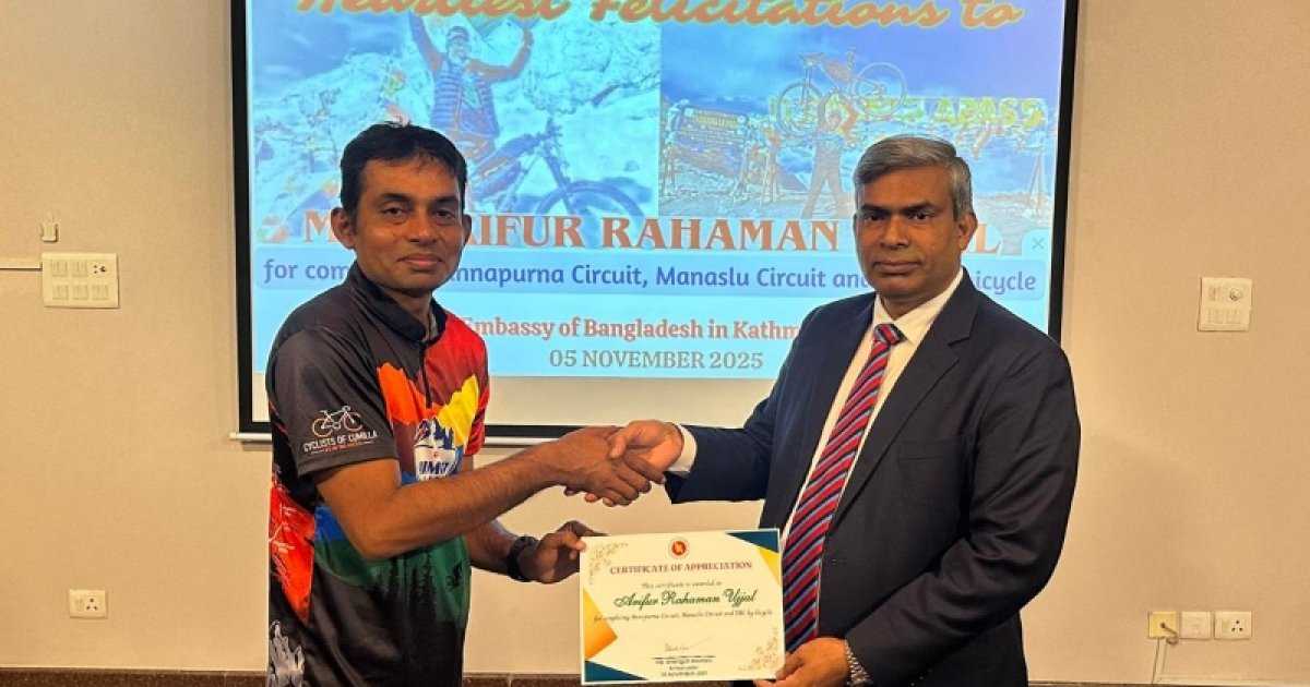 সাইকেলে চড়ে হিমালয় অঞ্চলের অন্নপূর্ণা সার্কিট, মানসলু সার্কিট এবং এভারেস্ট বেস ক্যাম্প ট্রেকিং করায় আরিফুর রহমান উজ্জ্বলকে সংবর্ধনা দিয়েছে কাঠমান্ডুতে অবস্থিত বাংলাদেশের দূতাবাস।