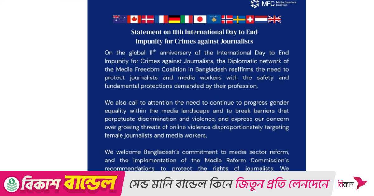 যৌথ বিবৃতিতে বলা হয়, সাংবাদিকদের বিরুদ্ধে করা অপরাধের দায়মুক্তি বন্ধের আন্তর্জাতিক দিবসের বিশ্বব্যাপী ১১তম বার্ষিকীতে বাংলাদেশে মিডিয়া ফ্রিডম কোয়ালিশনের কূটনৈতিক নেটওয়ার্ক সাংবাদিক এবং গণমাধ্যম কর্মীদের তাদের পেশার দ্বারা দাবি করা সুরক্ষা এবং মৌলিক সুরক্ষার সঙ্গে সুরক্ষার প্রয়োজনীয়তা পুনর্ব্যক্ত করে।