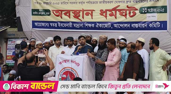 রোববার (১৯ অক্টোবর) জাতীয় প্রেসক্লাবের সামনে স্বতন্ত্র ইবতেদায়ী মাদরাসা শিক্ষক ঐক্যজোট ,আন্দোলন বাস্তবায়ন কমিটির অবস্থান ধর্মঘটে সংহতি জানিয়ে তিনি এসব কথা বলেন।