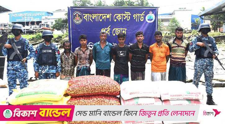 চট্টগ্রাম: শুল্ক-কর ফাঁকি দিয়ে মিয়ানমারে পাচারের জন্য বোঝাই করা বোট থেকে সাড়ে ১২ লাখ টাকার ১০০ বস্তা ডাল, ১৪৭ বস্তা পেঁয়াজ, ৩৫০ বস্তা সিমেন্টসহ ৭ পাচারকারীকে আটক করেছে কোস্ট গার্ড