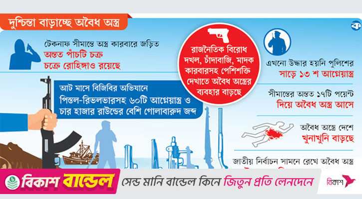 বাংলাদেশ-মায়ানমার সীমান্তের সাতটি পথে অবৈধ অস্ত্রের চালান দেশে ঢুকছে। এই অস্ত্রের কারবারে জড়িত রয়েছে কমপক্ষে পাঁচটি চক্র।
