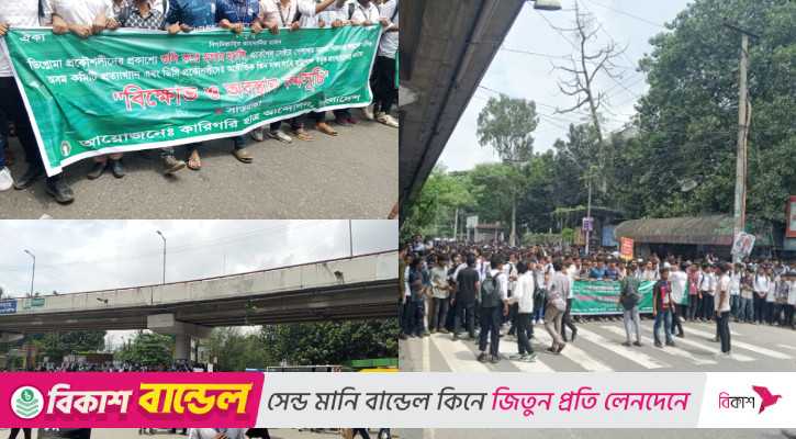 কারিগরি শিক্ষা ব্যবস্থা ধ্বংস ও প্রকৌশল কর্মক্ষেত্র কুক্ষিগত করার প্রতিবাদে এবং ছয় দফা দাবি বাস্তবায়নের দাবিতে রাজধানীর তেজগাঁও সাতরাস্তা মোড়ে অবরোধ কর্মসূচি পালন করছেন কারিগরি শিক্ষার্থীরা।