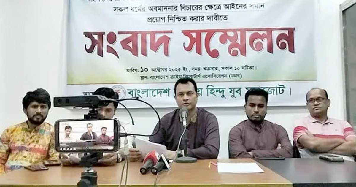 নাগরিক হিসেবে সব ক্ষেত্রে সমতা ও ন্যায্যতার দাবি জানিয়েছে ‘বাংলাদেশ জাতীয় হিন্দু যুব মহাজোট’। একইসঙ্গে দেশে বিদ্যমান সব ধর্মের অবমাননা রোধে সুস্পষ্ট আইন প্রণয়ন ও সব ধর্মের অবমাননার বিচারের ক্ষেত্রে আইনের সমান প্রয়োগ নিশ্চিত করাসহ চার দাবি জানিয়েছে সনাতন ধর্মাবলম্বীদের অধিকার নিয়ে কাজ করা এ সংগঠনটির নেতাকর্মীরা।