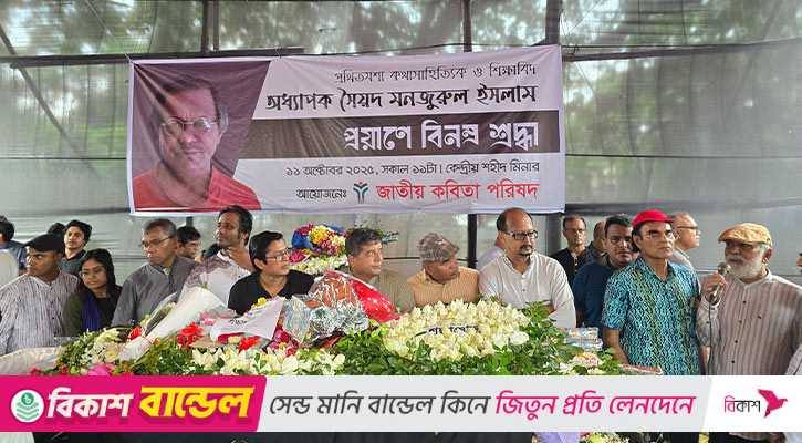 বৃষ্টি উপেক্ষা করেই কেন্দ্রীয় শহীদ মিনারে ইমেরিটাস অধ্যাপক সৈয়দ মনজুরুল ইসলামের প্রতি শ্রদ্ধা জানিয়েছেন বিশিষ্টজনেরা।