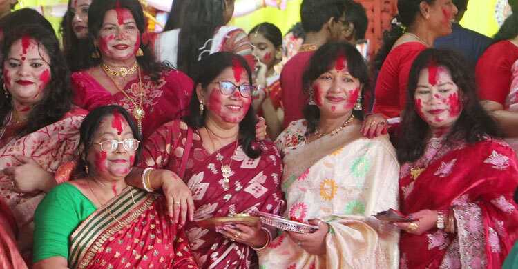 পূজা অর্চনার পর নারীরা দেবী দুর্গার সিঁথিতে শেষবারের মতো সিঁদুর পরিয়ে দেন, এরপরই শুরু হয় সিঁদুর খেলার উৎসব। জীবনকে রঙিন করে রাঙিয়ে তুলতে এবং আগামী দিনের জন্য শুভ কামনা জানাতে নারীরা একে অপরের গালে-মুখে সিঁদুর মেখে দেন। বিবাহিত নারীদের পাশাপাশি তরুণী ও শিশুদেরও এই সিঁদুর খেলায় অংশ নিতে দেখা যায়। এ সময় ঢাকের বাদ্যে প্রতিটি পূজামণ্ডপের পরিবেশ ছিল আনন্দমুখর।